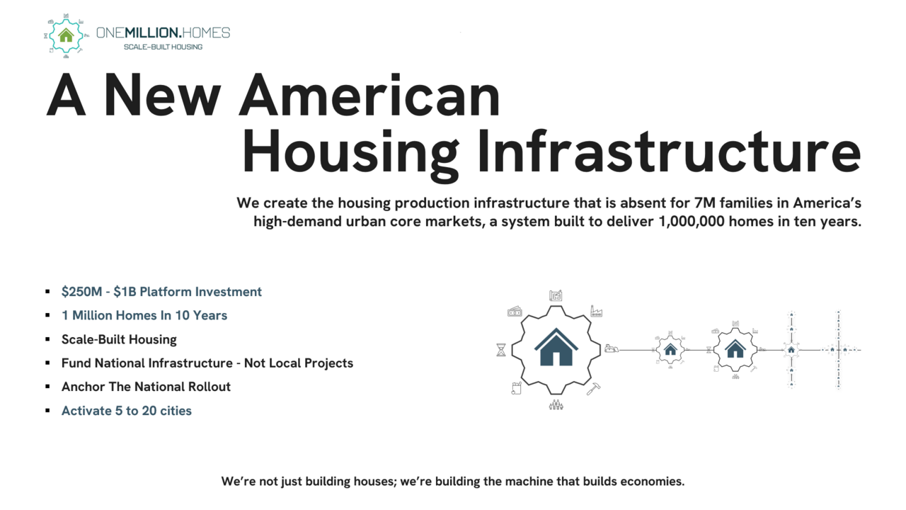 The New American Housing Infrastructure is a a new category of housing delivery: Scale-Built Housing. One strategy to deliver one million homes for underbuilt urban and rural American communities.